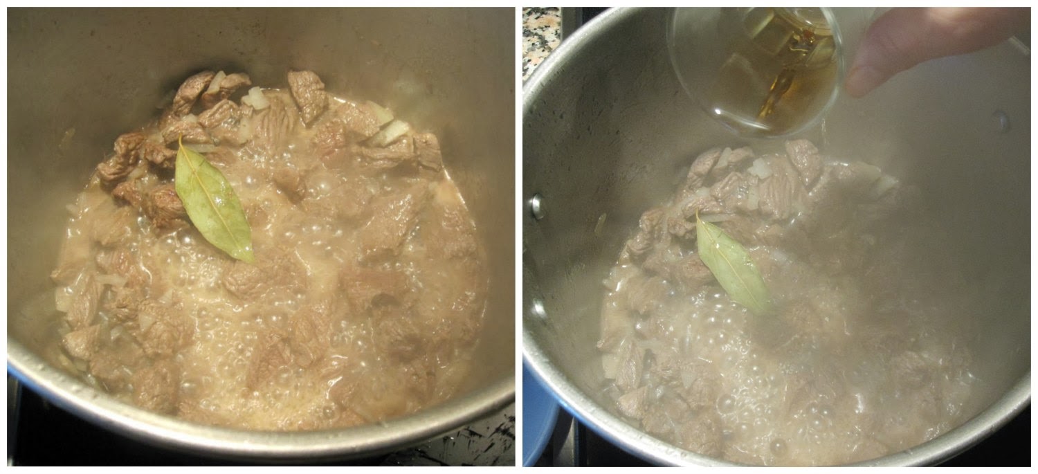 8. Añade la hoja de laurel y el vino blanco. Seguimos a fuego alto. Mezcla bien.