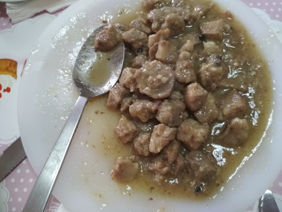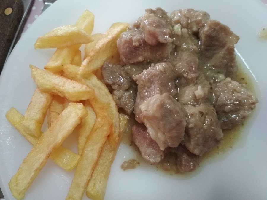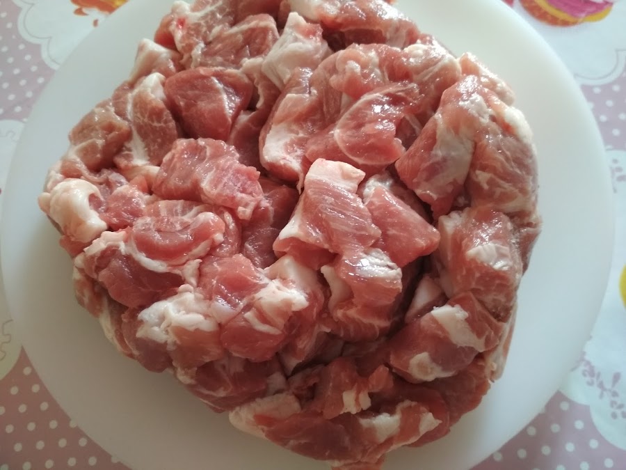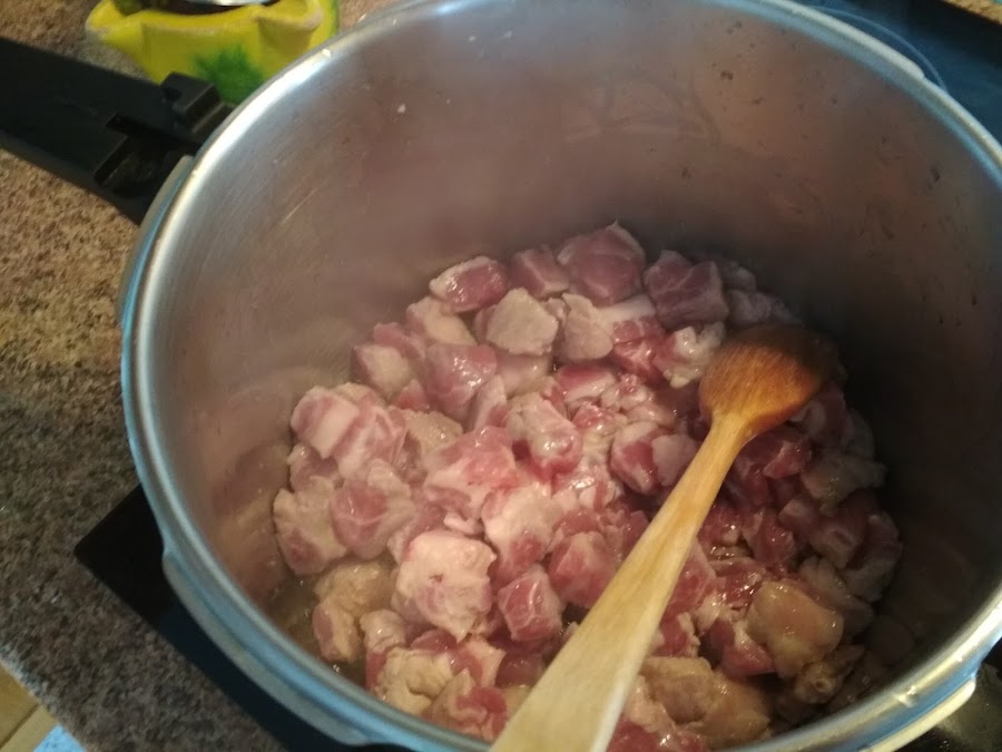 Ella la hace con magro de cerdo (normalmente de la parte del cuello), yo la he hecho con un magro de cerdo casero que me recomendó Juan, el hijo de mi carnicero, y ha sido un acierto total porque un cuarto de hora en la olla exprés ha sido suficiente para tener una carne increíblemente tierna, melosa y supersabrosa.
