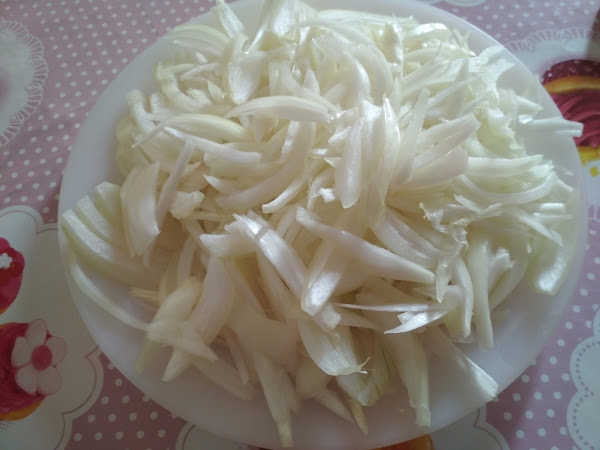 Echamos la carne a la olla y la dejamos que se vaya dorando, ponemos sal y vamos removiéndola, cuando lleve unos minutos y se vea que ha cambiado de color incorporamos las cebollas cortadas en juliana, éstas se desharán formando parte de la salsa.