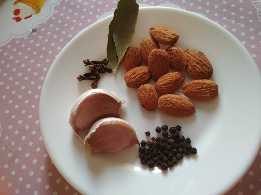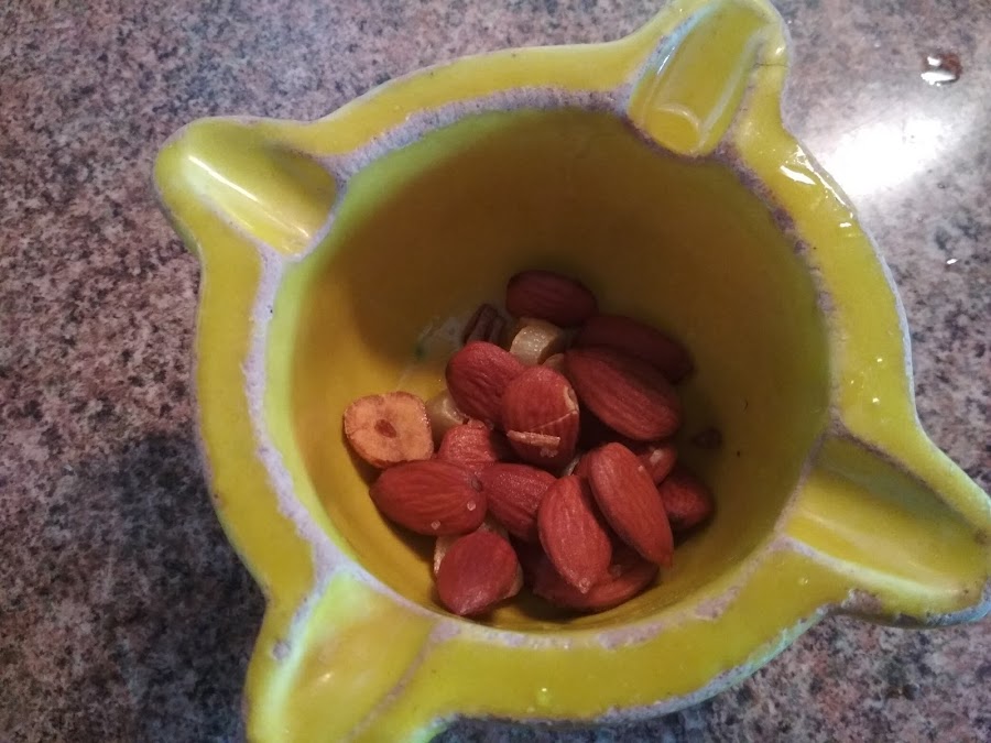 Empezamos poniendo la olla al fuego con aceite de oliva y cuando empiece a calentarse ponemos los ajos y las almendras. Se les da unas vueltas para dorarlo y se aparta a un mortero para hacer una picada.