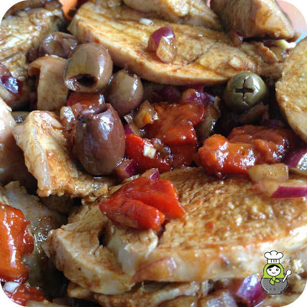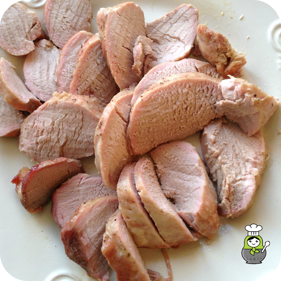 Asamos la carne, embadurnada de aceite y salpimentada, en el horno a 180º durante unos 20 minutos (es mejor que no esté muy pasada o quedará demasiado seca). Cuando esté lista, la sacamos, fileteamos y reservamos los jugos que suelta junto con los del pimiento.