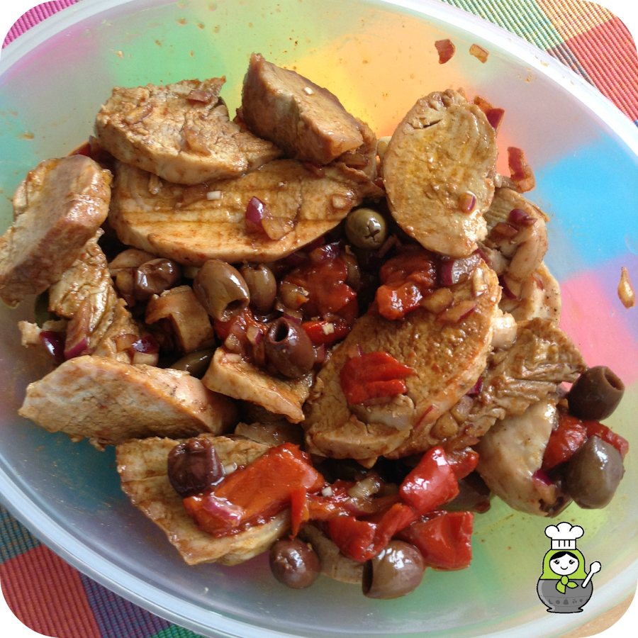Para terminar mezclamos la carne y los pimientos con el escabeche. Tapamos el bol y lo metemos en la nevera durante unas horas, mejor de un día para otro. La sacamos de la nevera un poco antes de consumirla, pues debe estar a temperatura ambiente.