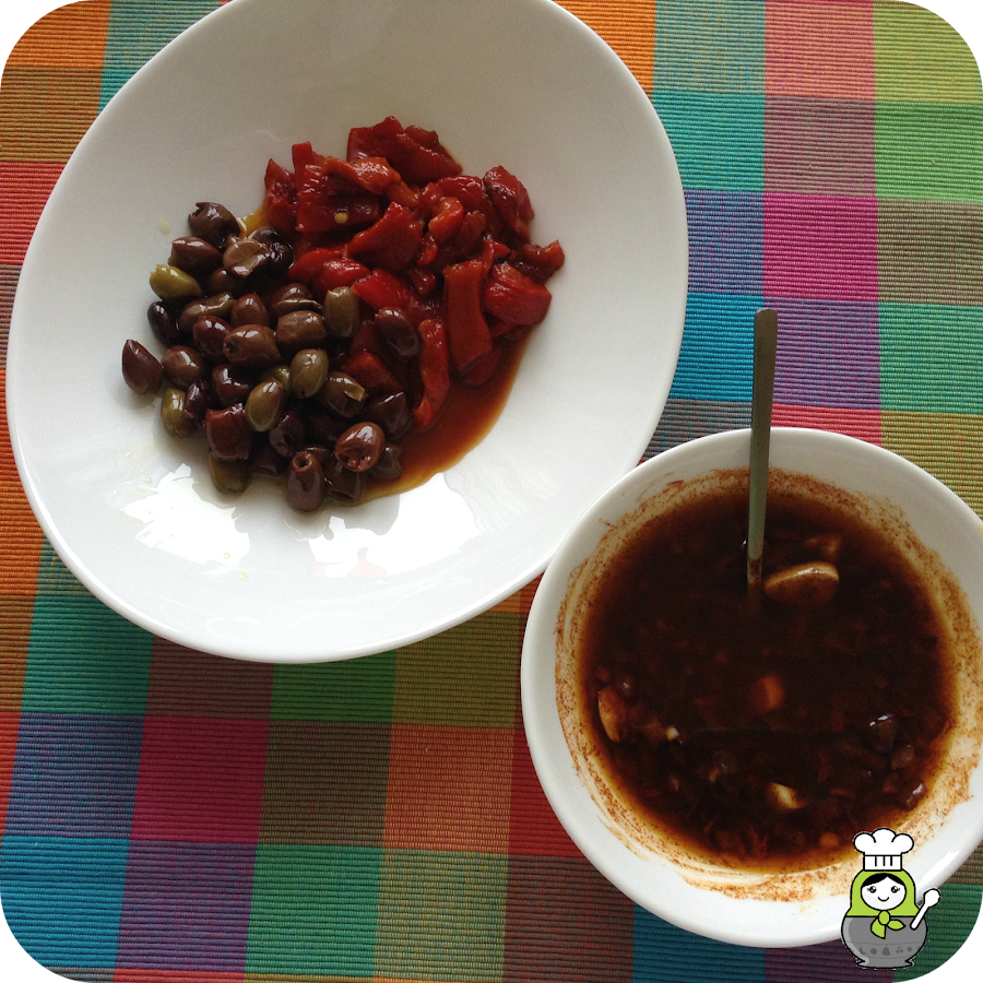 Por último en el vaso en donde teníamos los jugos, echamos 3 o 4 cucharadas de aceite, un chorro generoso de vinagre de Módena, la sal y el pimentón. Revolvemos bien y lo vertemos en el cuenco de las aceitunas. Revolvemos.