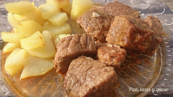 Cortamos la carne en dados, la sazonamos con ajo muy picado y la dejamos reposar 1 hora.