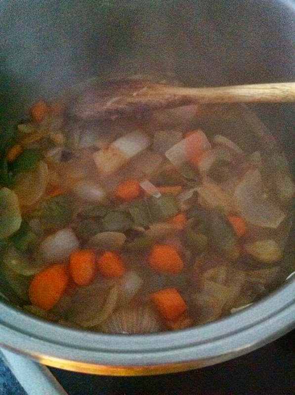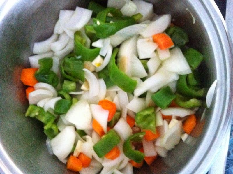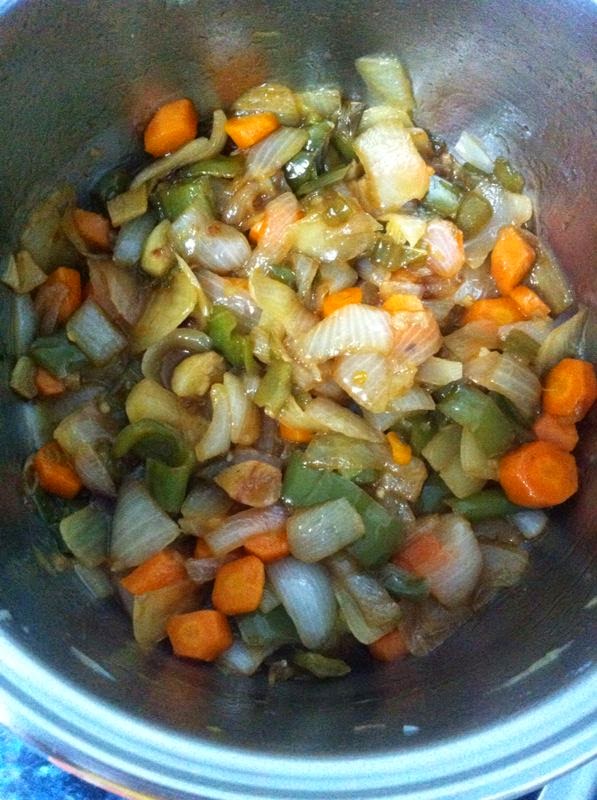 En la cual, añadiremos la cebolla picada, las zanahorias, los ajos y los pimientos verdes a sofreír.