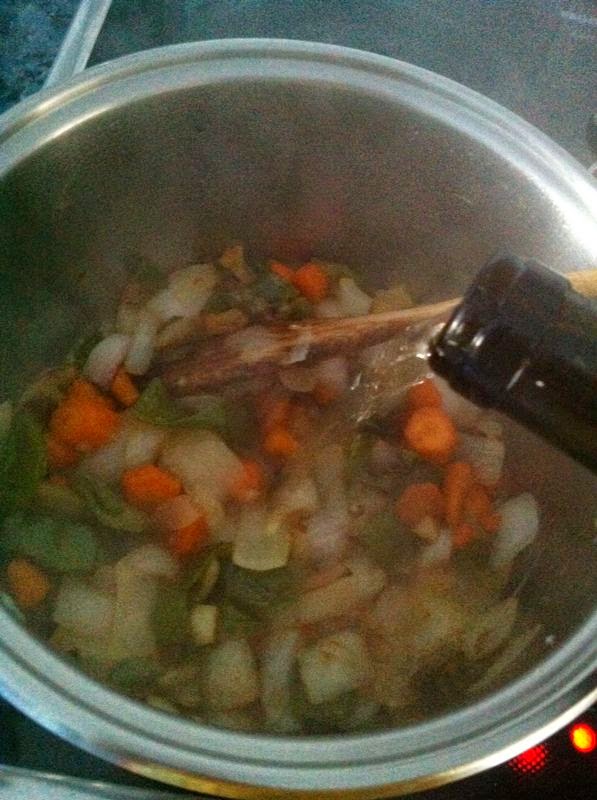 Cuando tengamos la verdura lista, añadiremos un buen chorro de vino blanco, y dejaremos reducir unos 5 minutos. Continuando a fuego medio.