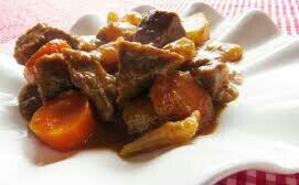 En una olla grande caliente colocar el aceite,cebolla dejar cristalizar luego agregar el ajo,tomate cocinar 5min más,colocar la carne cocinamos por 5min más,agregar las papas,zanahoria,pasta de tomate,sal,pimienta,canela,gengibre,laurel y el agua revolver cocinar a calor medio bajo por 2horas y media a quedar la carne bien suave,puede hacer también en olla de cocción lenta.