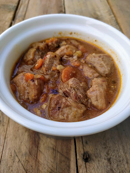 Carne magra de cerdo con salsa de verduras, la carne magra es baja en grasa y aporta un gran aporte en proteínas, se puede obtener de la paleta o del jamón, del solomillo o de la cinta de lomo.