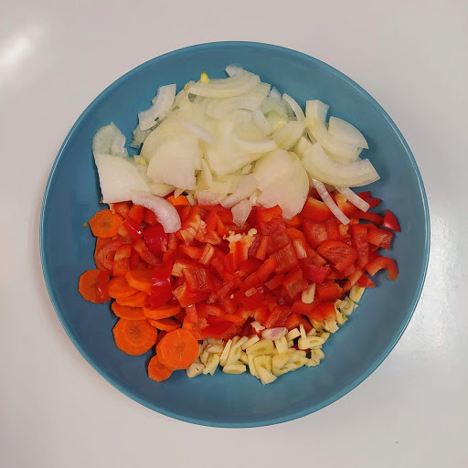 Mientras preparamos las verduras para la salsa, pelamos, lavamos las verduras y cortamos en trocitos pequeños.