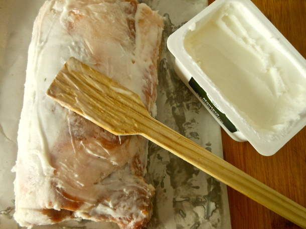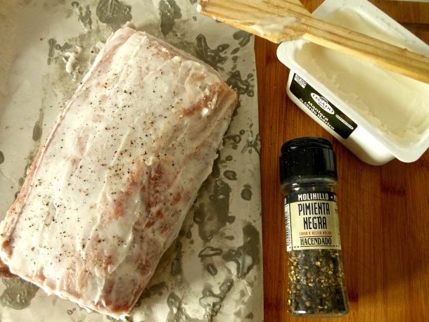 Tras esto unta el lomo por todos sus lados con una capita fina de manteca de cerdo y condiméntalo con pimienta negra al gusto. Si lo deseas puedes atar la pieza de carne con cordón de cocina.
