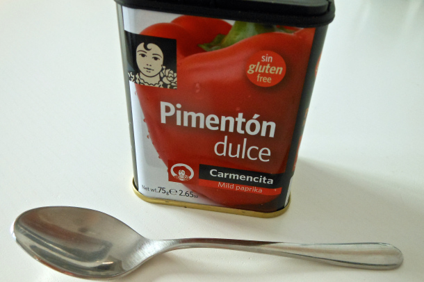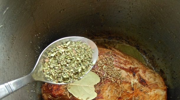 Seguidamente añade a la olla la cucharada de orégano, la cucharada de cominos, las hojas de laurel, la cucharadita de pimentón dulce y una poquita de sal fina.