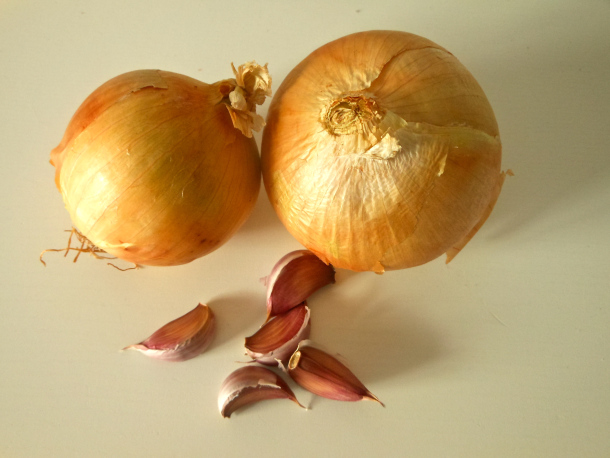 Comenzaremos pelando y picando las cebollas y los cinco dientes de ajo.