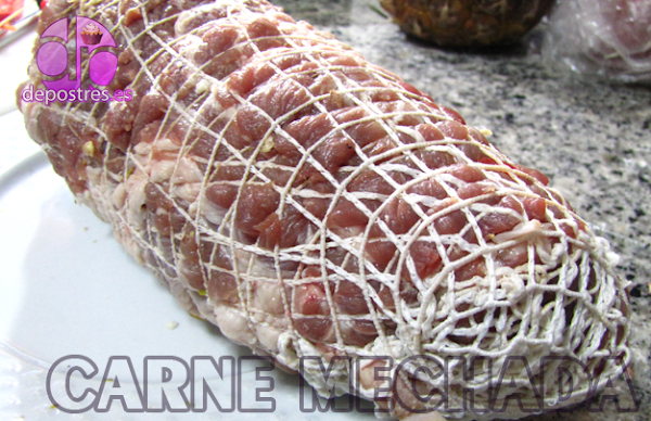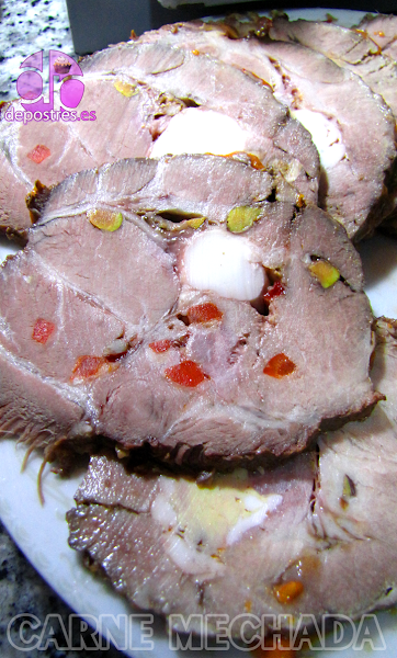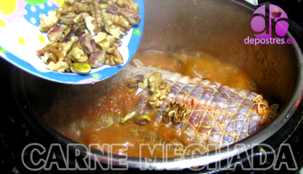 introducimos en la carne los distintos ingredientes del relleno. Lo he rellenado con bacon, pistachos, nueces, zanahoria, pimiento y el ajo.