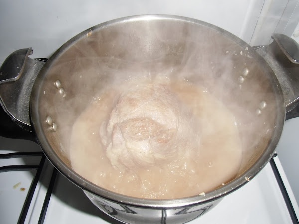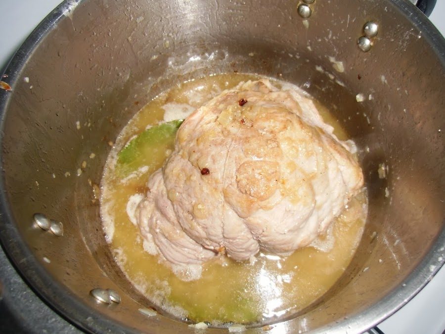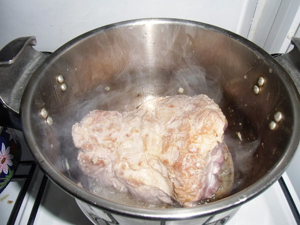 Cuando el vino reduzca agregamos agua de manera que casi cubra la pieza, tapamos y la tenemos durante 25 minutos desde que empieza a silbar la olla.