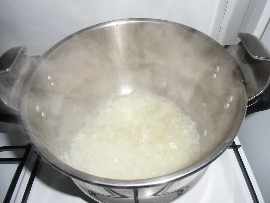 En una olla a presión con un poco de aceite de oliva sofreímos la cebolla y los ajos bien picados añadiendo un poco de sal, retiramos, lo batimos y reservamos.