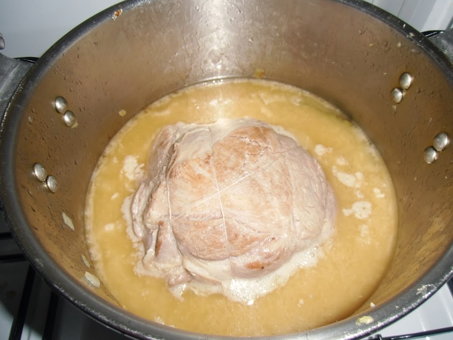 Ahora atamos la cabeza de cerdo para que mantenga mejor los jugos, la untamos en manteca de cerdo y la doramos un poco en el mismo aceite de antes