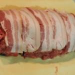 Extendemos una lámina de hojaldre y sobre ella ponemos nuestra carne picada formando un cilindro bien compacto. Sobre la carne colocamos unas láminas finas de beicon ahumado.