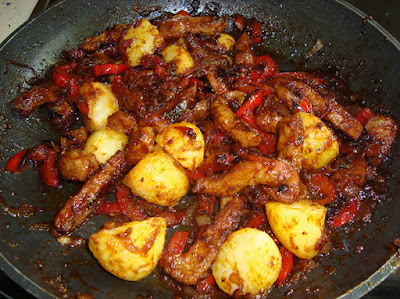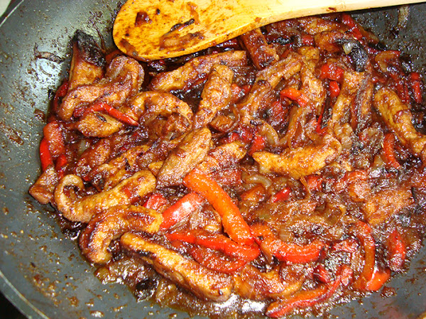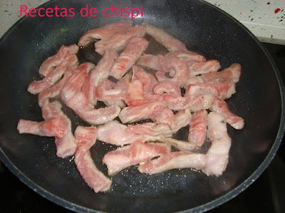 Triturar y reservar.Cortar la carne en tiritas finas y salar un poco, saltear a fuego fuerte en poco aceite.