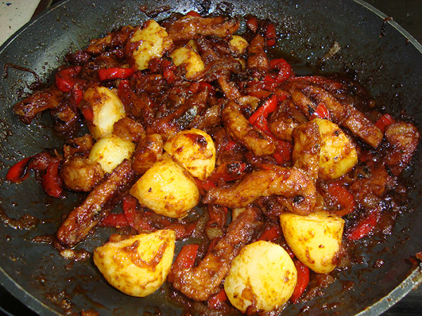 vinagre.Lavar y poner a cocer las patatas en abundante agua hasta que estén tiernas, reservar.
