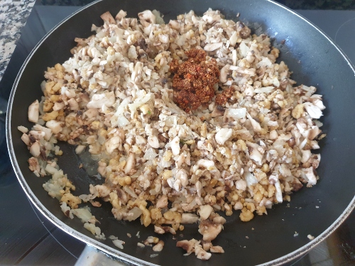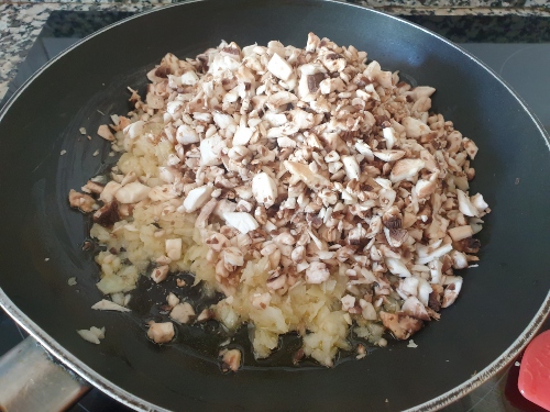 2. En una sartén pon el aceite y cuando esté caliente, añade la cebolla y sofríe durante cinco minutos. Luego añade los champiñones y sigue rehogando. Finalmente añade las nueces.