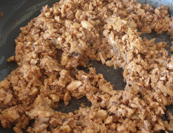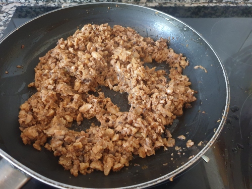 El tiempo indicado es para que se evapore bien el líquido que sueltan la cebolla y los champiñones. Es posible que se necesite más o menos tiempo. Vigila la sartén para que la carne vegetal quede sequita.