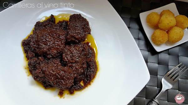 Carrilleras en vino tinto. De ahí el buen color que tiene este plato y, aunque no podéis saborearlas, os aseguro que están deliciosas. ¡La foto lo dice todo!