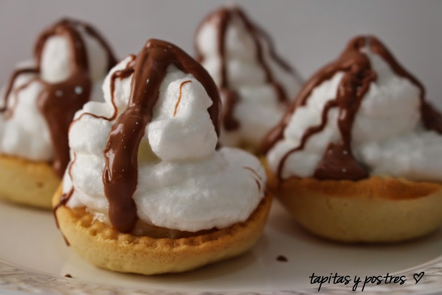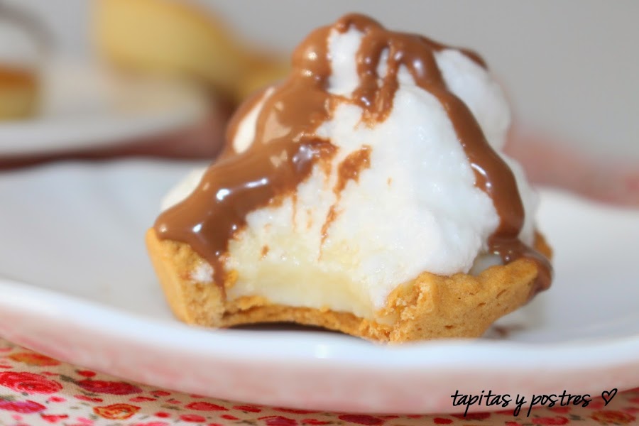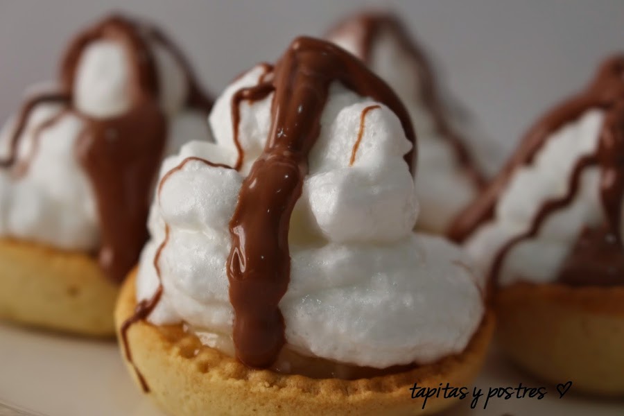 El montaje es bien sencillo, ponemos una cucharada de crema pastelera sobre las tartaletas, hacemos una montaña de merengue sobre ellas y fundimos un poco de chocolate al micro y dejamos caer en forma de hilo sobre el merengue.
