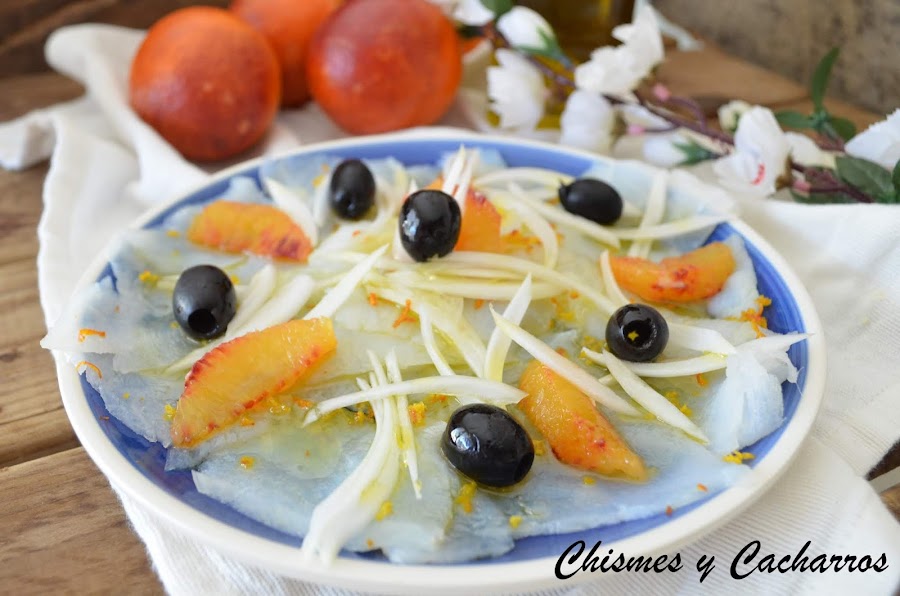 Cortar la cebolleta en juliana (1 o 2 según gustos), la naranja en gajos sin nada de piel y colocar sobre el bacalao, también las aceitunas.