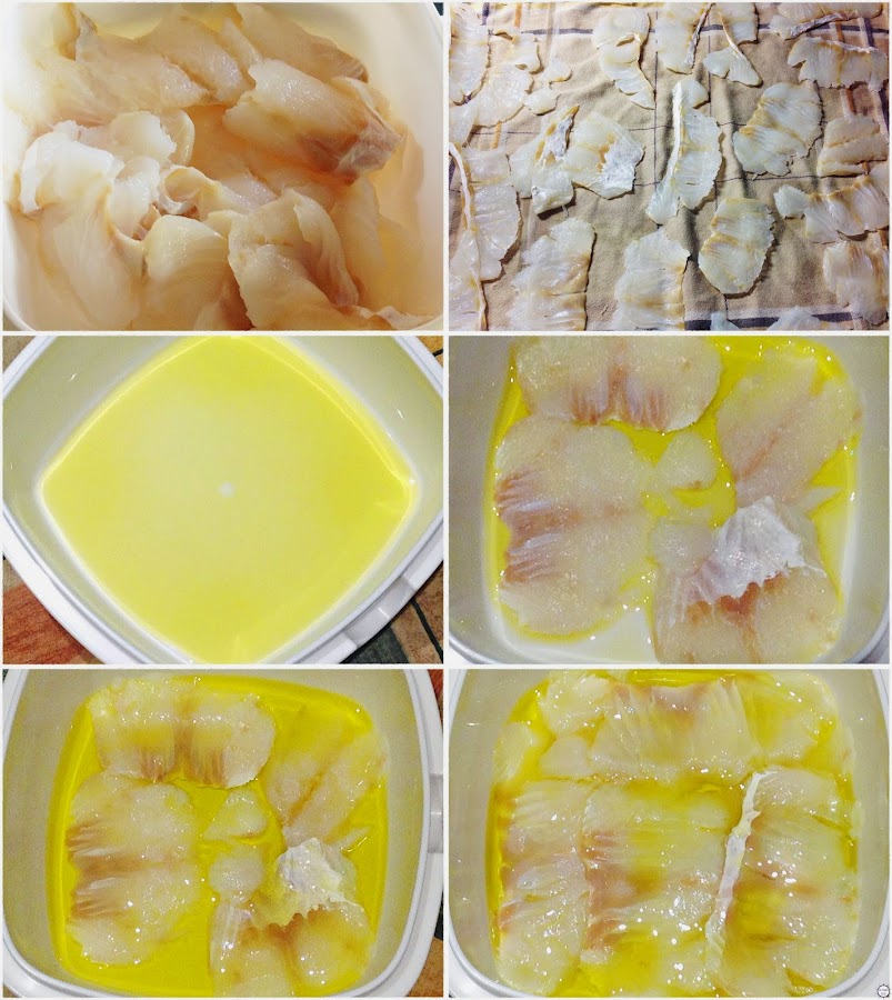 Cubre la base de un bol con aceite, y cubre con tiras de bacalao. Cubre nuevamente con aceite, añade nuevamente aceite. Así hasta colocar todas las tiras de bacalao. Lo dejé una noche en la nevera.