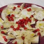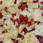 Rociamos con unas cucharadas de aceite de oliva virgen, ponemos pimienta molida al momento, unas escamas de sal Maldon y, por último, unos granos de granada.