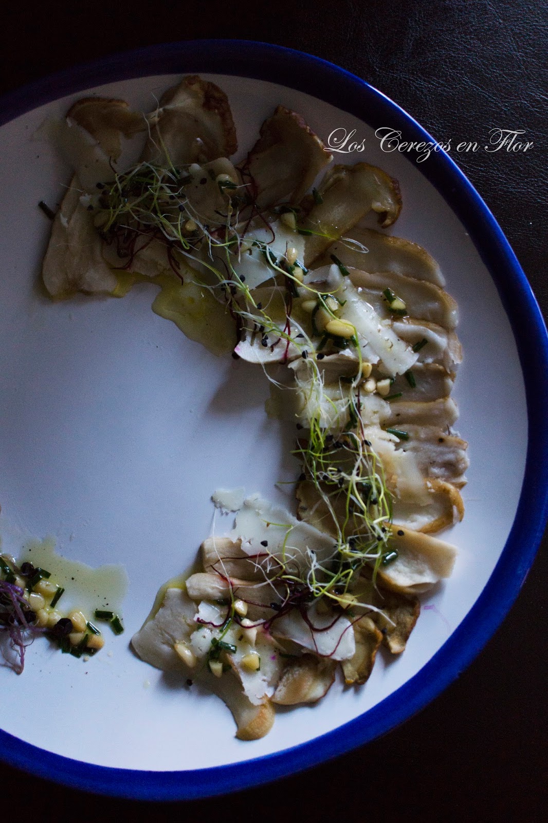 Últimamente voy fatal de tiempo, estoy liada haciendo cosas y cuando me quiero dar cuenta el nuevo mes está a punto de empezar y yo aún sin hacer la receta. Suerte que es cuestión de días porque en nada mis hijos disfrutarán de dos semanas de vacaciones. Qué alegría dejar el despertador dentro del cajón y las prisas en el fondo de la memoria, ahora toca sólo pensar en que invertir las horas para pasarlo a lo grande. Puede que salgamos en busca de la nieve para tirarnos en trineo o simplemente pasear y disfrutar de las vistas de la montaña. Os confieso que no me gusta nada el invierno. El frío, la nieve y el mal tiempo me pone de un melancólico que no va nada de nada con mi cutis. Por mucha crema que me ponga las arrugas del ceño no me las quita nadie, si es que sin querer no hago más que arrugar la nariz jajaja, luego en cuanto veo a mis hijos disfrutando como enanos entonces se me pasa un poco, pero a la que empiezo a perder sensibilidad en mis pies y en la punta de la nariz me entran todos los males. Se nota que soy de mar verdad?. Hace un par de semanas mi hijo tuvo la experiencia de su vida creando un igloo, ahora ya puedo dormir tranquila porque si algún día nos quedamos atrapados en la nieve, nos construirá uno jajajaja, ya le he dicho que yo pongo los cuadros y alfombras para hacerlo más acogedor pero se coge unos cabreos conmigo increíbles, encima que quiero ponerlo bonito! Mecachis estos adolescentes que poco sentido del humor tienen!! Ojalá no me vea yo jamás en la tesitura de tener que crear un igloo, sólo de pensarlo se me ponen los pelos como escarpias! Quita quita, voy a pensar en la receta y dejar a un lado el frío y el hielo. Hablando de hielo y congelado, cuando estuve en el super pijo de aquí hace unas semanas encontré una bolsa de boletus enteros que no tenían mala pinta. No los cogí porque encontré frescos y para la receta de Joan Roca eran la mejor elección ( aunque los que encontré eran demasiado grande) , pero estoy pensando que la próxima vez los compraré, ya tengo en mente un par de recetas en los que me vendrán de perlas. Creo que ha llegado el momento de ponernos el delantal y prepararlo todo para elaborar éste sencillo pero delicioso Carpaccio de Boletus.