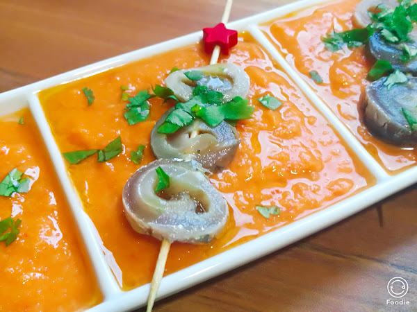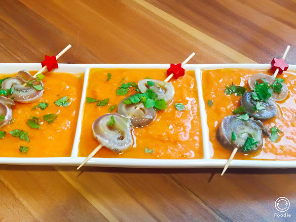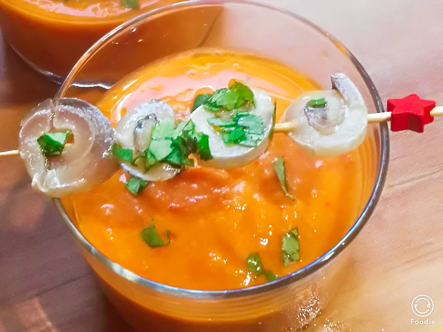 - Servimos el salmorejo y encima los palillos de boquerones, espolvoreando cilantro picado (o perejil, cebollino...)