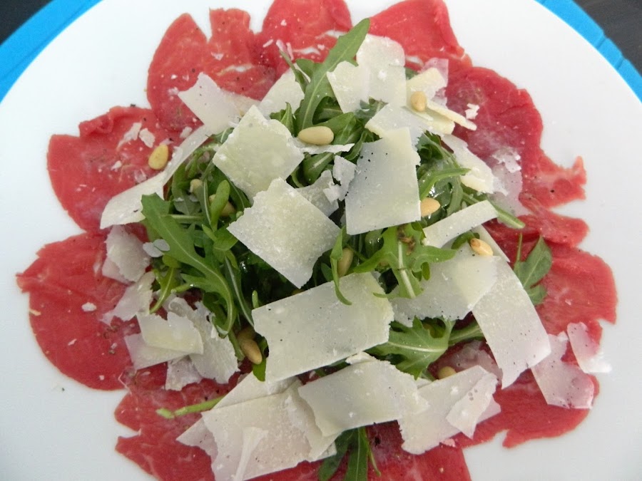 Si no tenemos una máquina corta fiambres, podemos comprar ya cortado que venden en raciones, y modificarlo con este aliño, la rúcula y el parmesano.