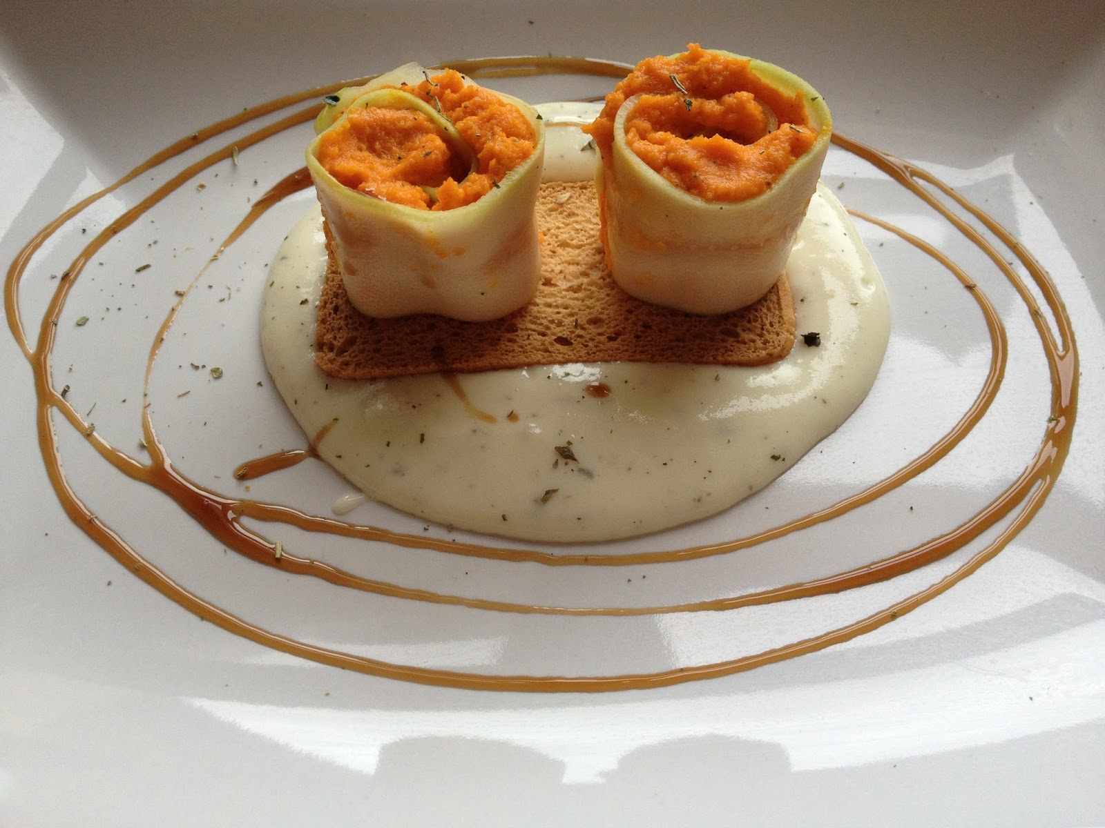 Extendemos el calabacin y lo cubrimos con un poco de crema de zanahoria , lo enrollamos y reservamos