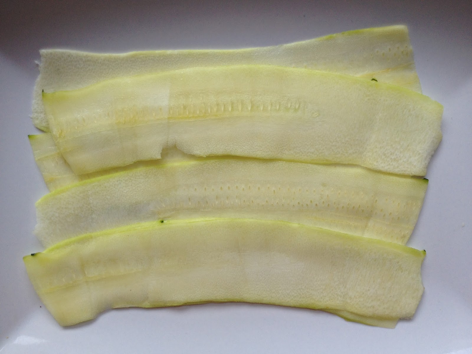 2 Mientras, con la ayuda de un pelador, quitamos la piel al calabacin y sacamos las tiras para el carpaccio. Para sacar las tiras para el carpaccio, una vez quitada la piel , lo cortamos por la mitad y con el pelador , sin levantar el pelador del calabacin, tiramos de arriba hacia abajo, veremos que sale una fina tira de calabacin .
