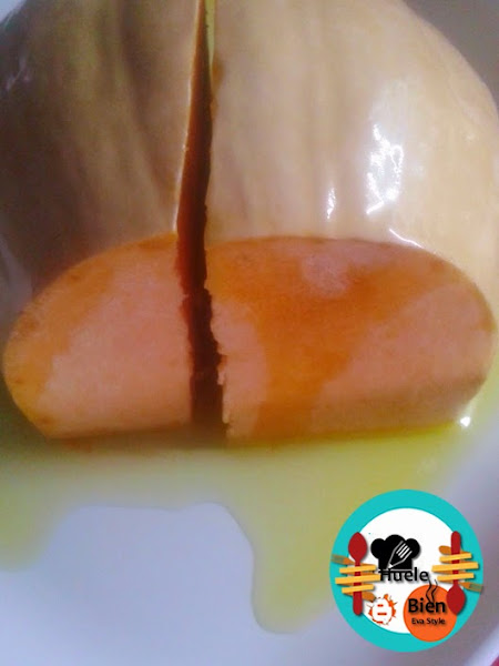 1.- Retiramos las semillas de la calabaza. En una fuentes de horno ponemos la calabaza con un poco de aceite de oliva sal y pimienta. La asamos 30 minutos a 180º.