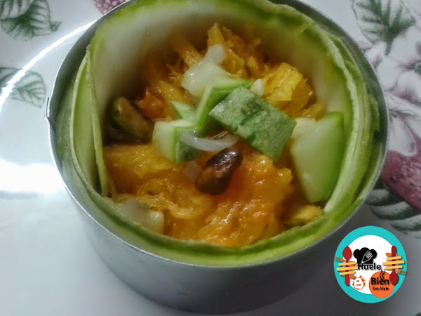 5.- Colocamos el carpaccio dentro de un aro de cocina. Cubriendo la pared. Rellenamos con la calabaza asada sin la piel, cortada en varios trozos. Añadimos el calabacín, la cebolla y los pistachos cocinados. Reservamos.
