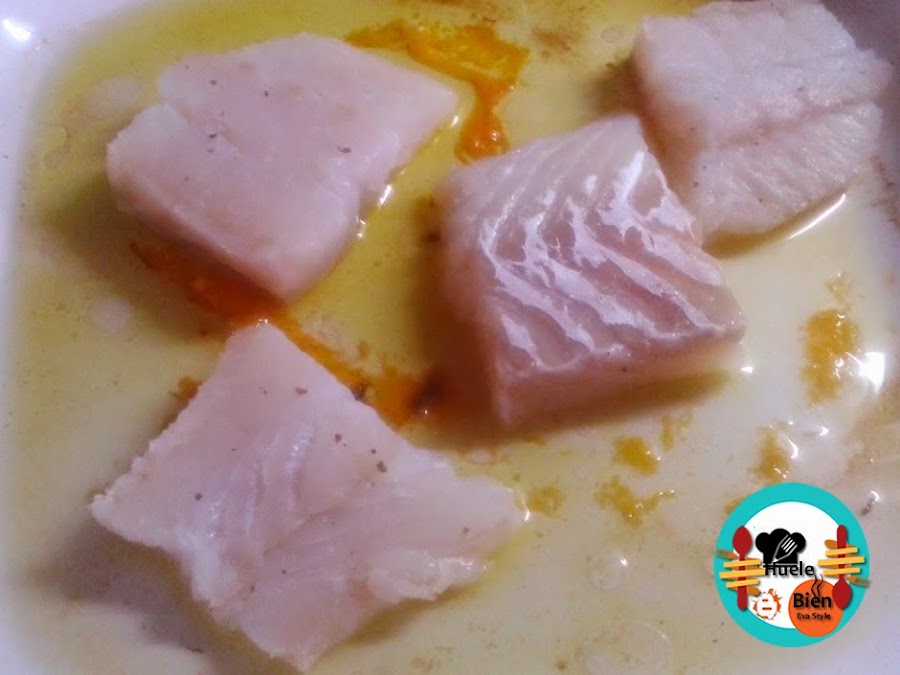 6.- En la misma fuente donde hemos asado la calabaza. ponemos el bacalao cortado en varios trozos. Lo salpimentamos, lo bañamos el con aceite y el jugo de la calabaza. Dejamos que se cocine 5 minutos a 180ºC.