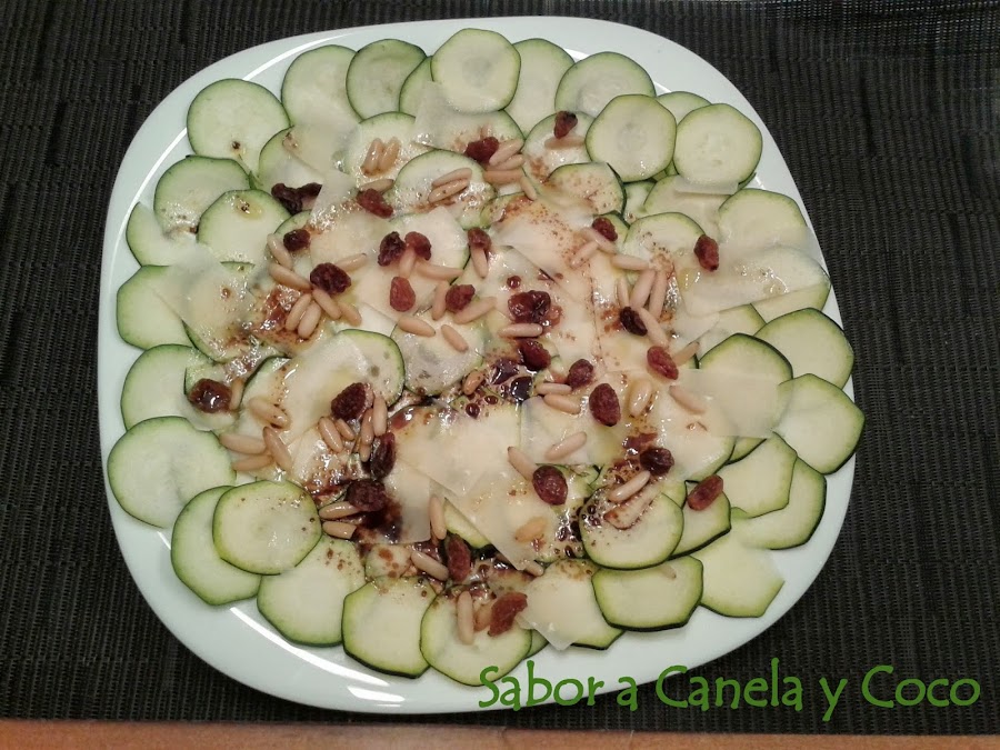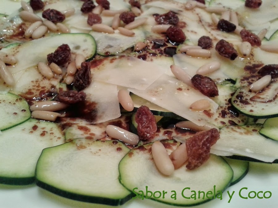Ponemos las láminas de calabacín en un plato y añadimos por encima las pasas, los piñones y el queso y aliñamos con la vinagreta.
