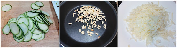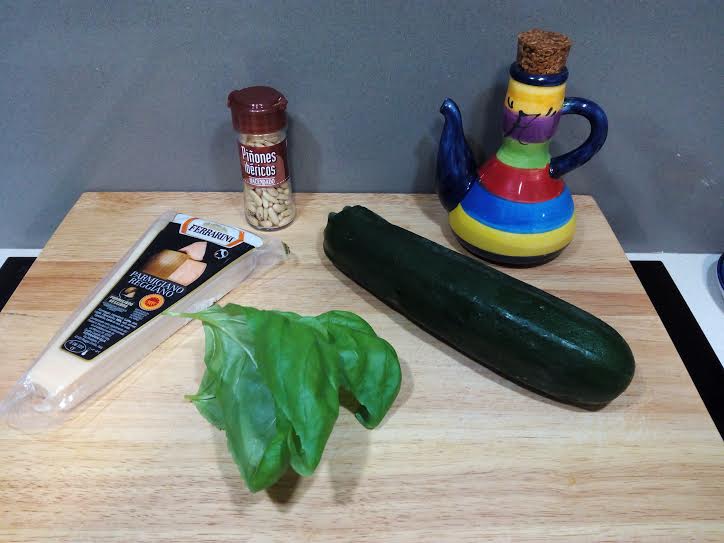 Lavamos el calabacín y lo cortamos en rodajas muy finas. Yo he usado una mandolina pero si tenéis maña con el cuchillo también podéis hacerlo así. Tostamos los piñones en una sartén y rallamos un poco de queso. Preparamos un aceite de albahaca triturando ésta con un buen chorro de aceite.