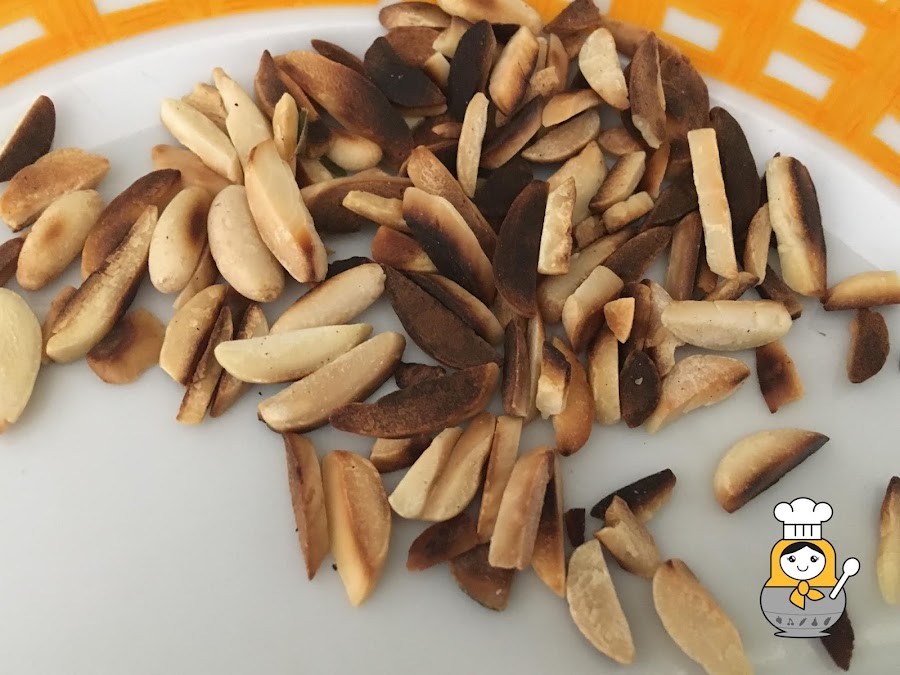 En una sartén tostamos la almendra y los piñones picados. Mientras tanto, rallamos una cantidad generosa de queso parmigiano, casi tipo lascas.