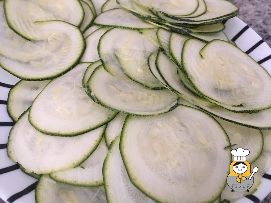 Con ayuda de una mandolina, laminamos el calabacín lo más fino que seamos capaces. Lo interesante es conseguir unas láminas muy finas. Disponemos el calabacín en la fuente o plato en que lo serviremos y con ayuda de un pincel de silicona lo barnizamos con aceite de oliva. Reservamos.