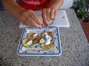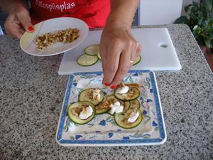 Lava y corta en rodajas muy finas el calabacin. Pon 1 capa en una fuente o plato y reparte sobre ellas unas pequeñas bolitas de queso crema, unas nueces y un poco de aliño.