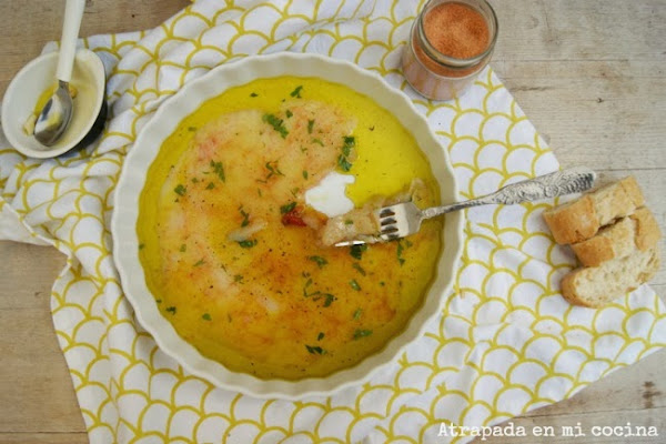 También prepararemos el aceite para que vaya cogiendo aromas "al ajillo". En una cucharada de aceite calentamos los ajos laminados y una guindilla. Cuando empiece a tostarse, unos minutos, retiramos del fuego. En un bote añadimos una generosa cantidad de AOVE, y también añadimos el aceite de la sartén, los ajos y la guindilla. Las cabezas que habíamos reservado las pasamos por la sartén unos minutos y estrujamos un poco para que suelten un poco de liquido, que añadiremos al aceite. Removemos y guardamos cerrado durante unas horas, hasta la hora de servir.