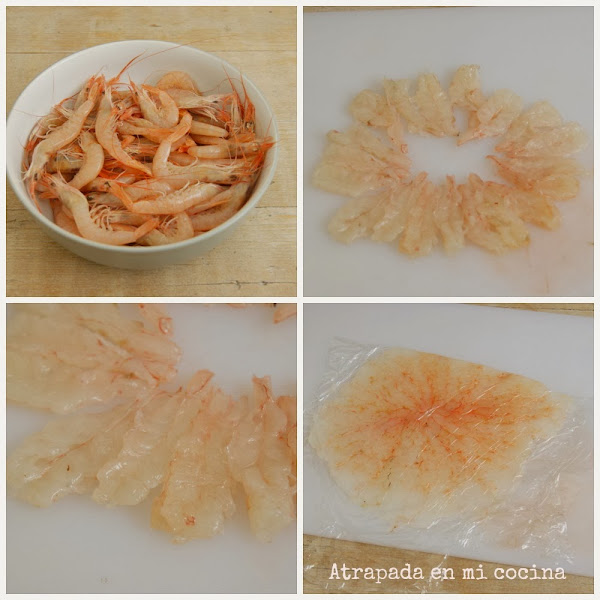 Antes de nada quería comentaros que si podéis acceder a comprar alguna gamba roja el plato ganará mucho en color, aunque yo busqué, y, debido al temporal, no pude encontrar ni quisquilla de Motril ni gamba roja de Garrucha, pero si podéis encontrarla el plato ya será de lujo, aunque ya sabéis que también se incrementará el precio, claro. Yo esta gamba blanca la estoy comprando estas semanas a 16 o 18 euros el kilo, pero con 300 gr. tendréis suficiente para un plato como el de la foto. Lo ideal es preparar las gambas la noche anterior o unas horas antes, para que de tiempo congelarlo. Está claro que lo más laborioso es limpiar y abrir la gamba. Para ello empezaremos por lavar y pelar las gambas. Guardaremos algunas cabezas para el aliño y las demás, junto con las pieles las dejaremos para preparar la sal de gamba. Una vez peladas, abrimos en forma de libro y quitamos los intestinos o hilito negro que lleva la gamba, dejándola completamente limpia. Una vez abiertas y limpias todas dispondremos sobre una tabla y papel film de forma ordenada, dejando algo de separación entre ella. Tapamos con papel film y vamos aplastando con el culo de una cacerola hasta dejar las gambas muy finitas. Veréis como se van expandiendo las gambas e intentaremos darle forma redondeada al conjunto. Guardamos encima de la tabla en el congelador hasta la hora de servir.