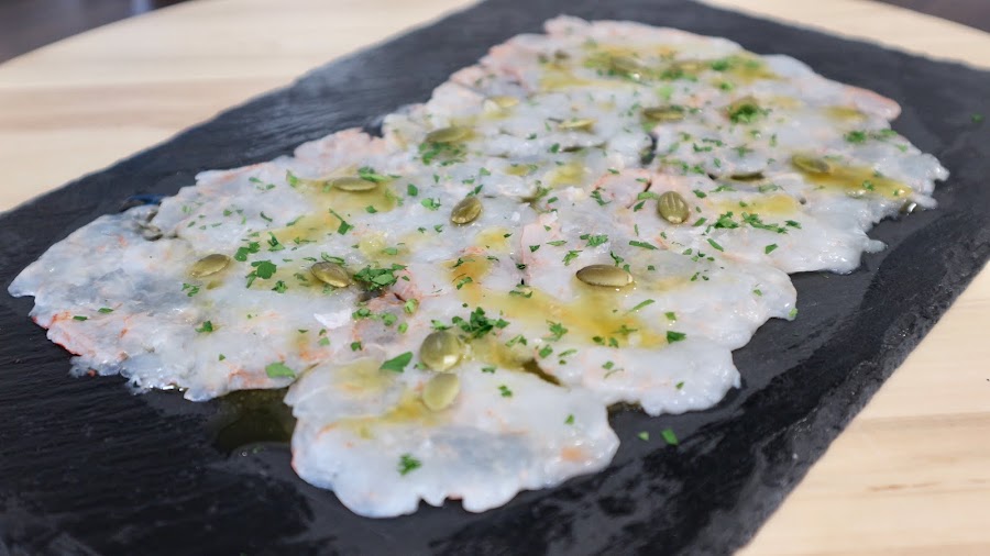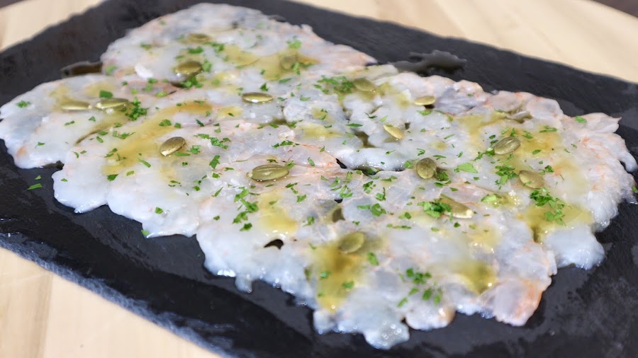 4º Para emplatar el carpaccio quita con cuidado una de las capas de papel transparente, coloca un plato con la forma del carpaccio encima de las gambas, dale la vuelta como si de una tortilla española se tratase y retira la otra capa de papel, agrega unas escamas de sal, el aceite de gambas, las pipas de calabaza y por ultimo un poco de perejil fresco picado, a disfrutar!! espero que te encante es un plato riquísimo.