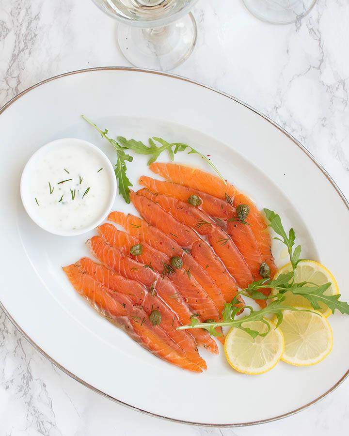 Corta el salmón en láminas muy finas colocando el cuchillo en diagonal y sin llegar a cortar la piel del salmón. Dispón el salmón en un plato, añade un poco de aceite y acompáñalo con la salsa de yogur. También os recomiendo añadir alcaparras y hojas verdes como la rúcula.