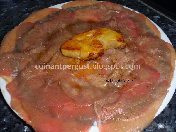 En un cuenco mezclar aceite de oliva, unas gotas de vinagre de Módena, sal y pimienta al gusto. Batir la vinagreta para que todos los ingredientes se amalgamen. Disponer una capa de carpaccio sobre un plato y con un pincel pintarlo con la vinagreta. Poner otra capa encima y repetir la operación. Poner a calentar una sartén sin aceite y marcar el foie por ambas caras. Disponerlo en el centro del plato de carpaccio. Servir inmediatamente.
