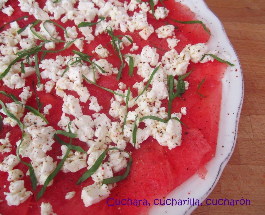 2.- Partir la sandía en rodajas muy finas. Distribuir sobre el plato y cubrir con el queso feta desmigado.