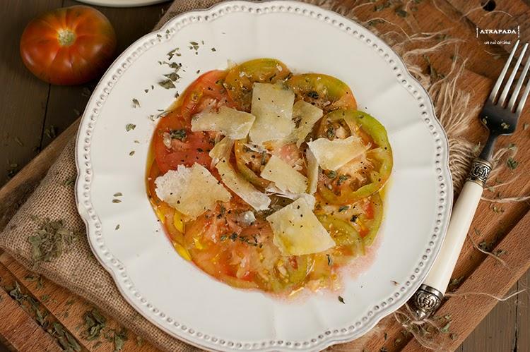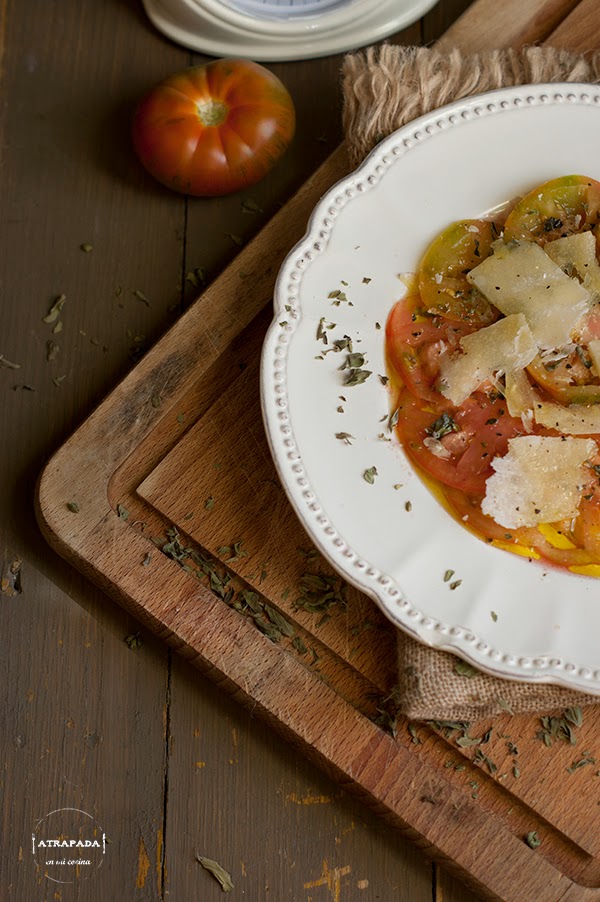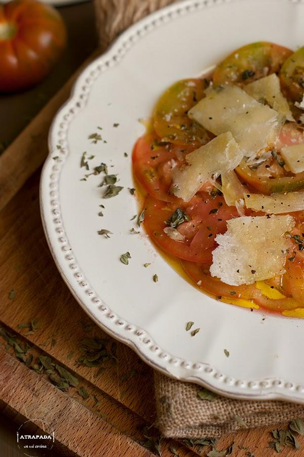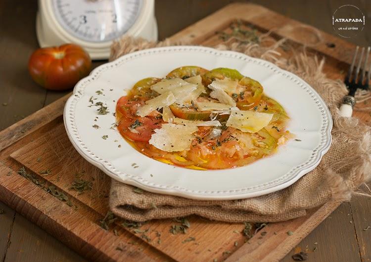 Es sumamente sencilla la receta, sin ninguna dificultad, sólo intentad cortar el tomate lo más fino posible. Y disfrutar de un tomate que sabe a tomate.